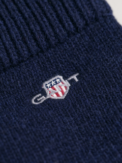 Deep marine wool gloves distinguished by the embroidered shield – essential armor for the modern gentleman’s winter wardrobe.